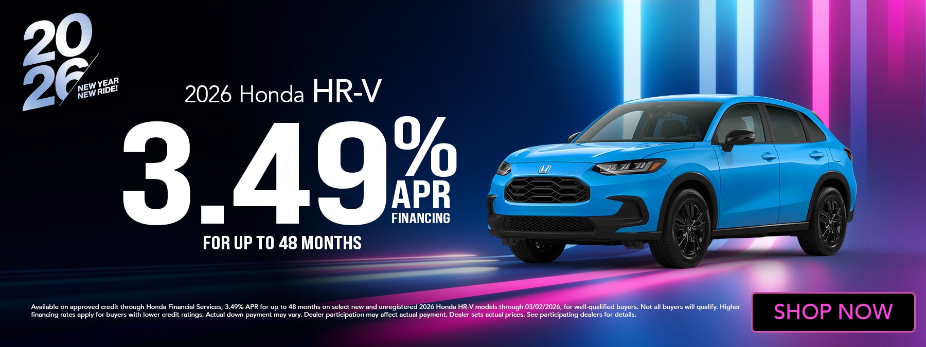Available on approved credit through Honda Financial Services, 3.49% APR for up to 48 months on select new and unregistered 2026 Honda HR-V models through 03/02/2026, for well-qualified buyers. Not all buyers will qualify. Higher financing rates apply for buyers with lower credit ratings. Actual down payment may vary. Dealer participation may affect actual payment. Dealer sets actual prices. See participating dealers for details.